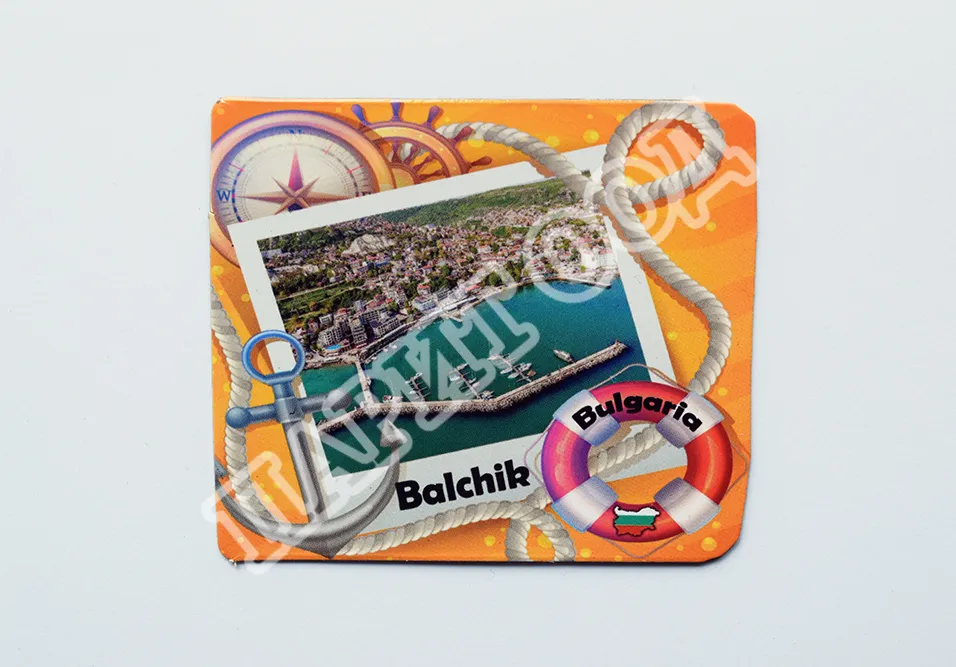 Сувенирен магнит със снимка от Балчик и надпис Балчик, България. Предлага се опакован в щендерен целофан.