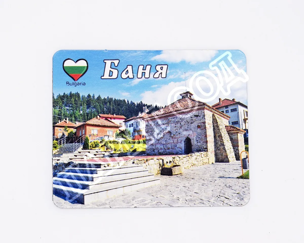 Сувенирен магнит със снимка от с. Баня, Разлог. Предлага се опакован в щендерен целофан.