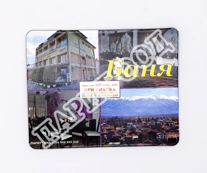 Сувенирен магнит със снимки от с. Баня, Разлог. Предлага се опакован в щендерен целофан.