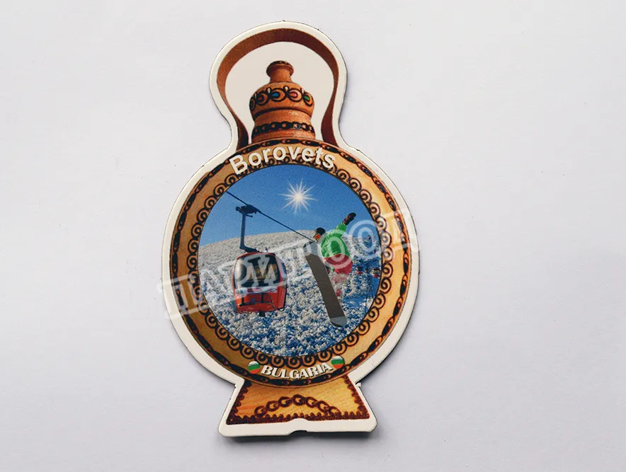 Сувенирен магнит със снимка от Боровец и надпис Боровец, България. Предлага се опакован в щендерен целофан.