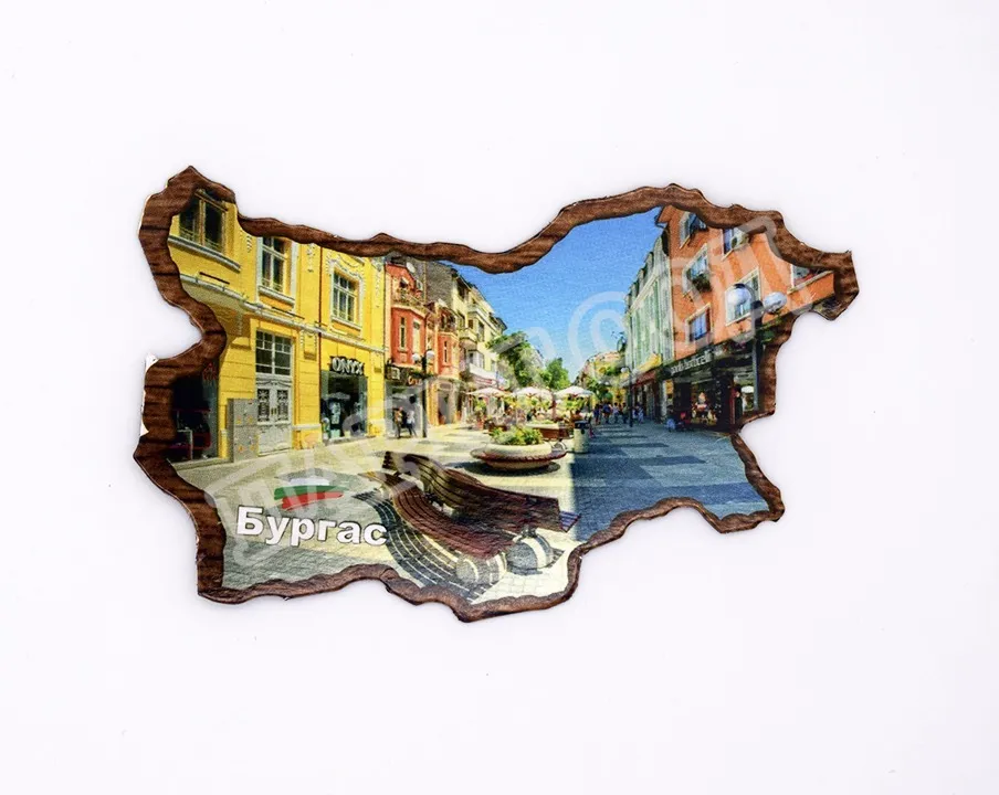 Сувенирен магнит със снимка от Бургас. Предлага се опакован в щендерен целофан.