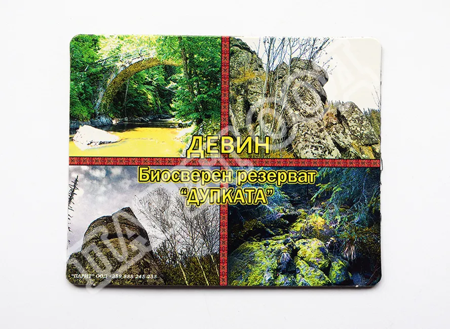 Сувенирен магнит със снимки от биосверен резерват ,,ДУПКАТА“, Девин. Предлага се опакован в щендерен целофан.