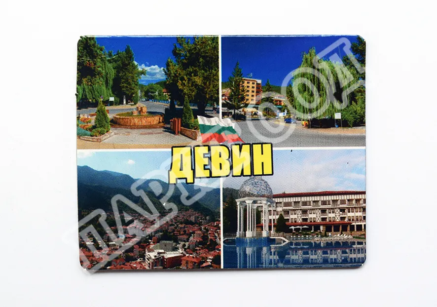 Сувенирен магнит със снимки от Девин. Предлага се опакован в щендерен целофан.