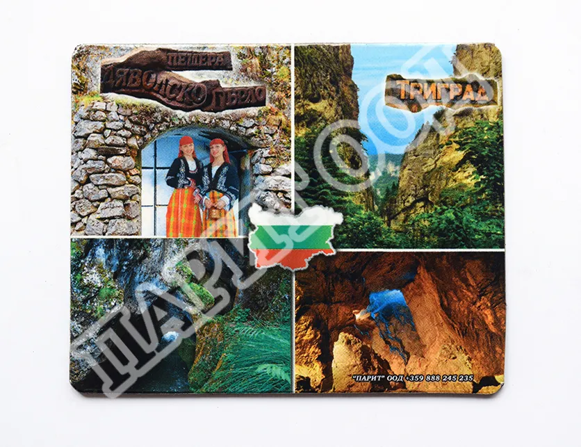 Сувенирен магнит със снимки от пещера ,,Дяволско гърло“, Триград. Предлага се опакован в щендерен целофан.