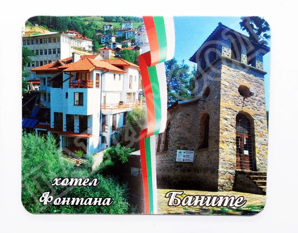 Сувенирен магнит със снимка от хотел Фонтана, с. Баните. Предлага се опакован в щендерен целофан.