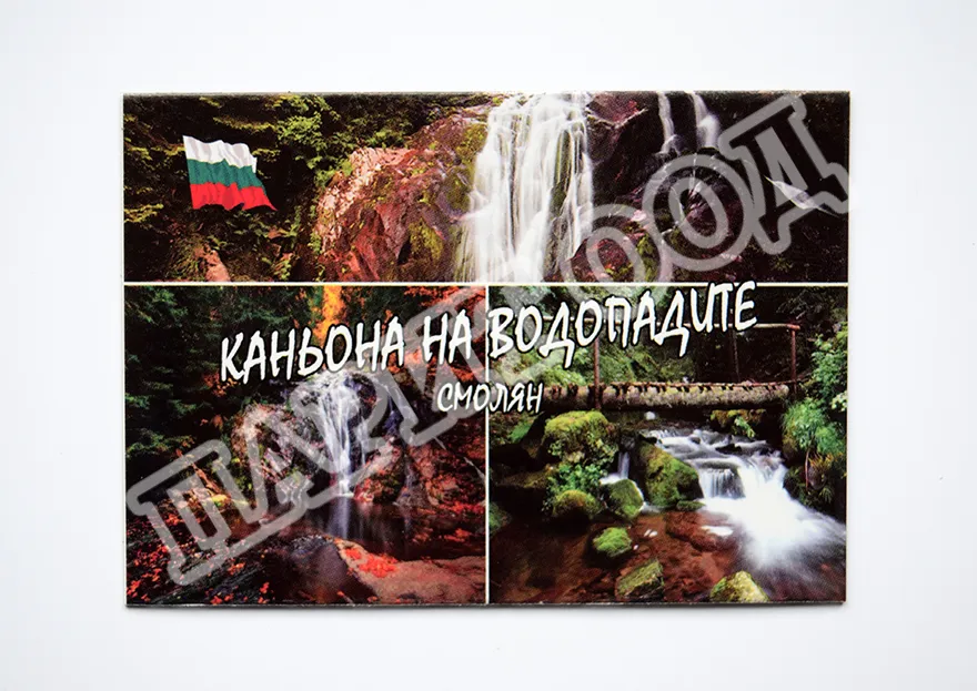 Сувенирен магнит със снимки от екопътека ,,Каньонът на водопадите“, Смолян. Предлага се опакован в щендерен целофан.