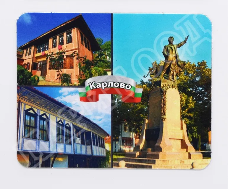 Сувенирен магнит със снимки от Карлово. Предлага се опакован в щендерен целофан.