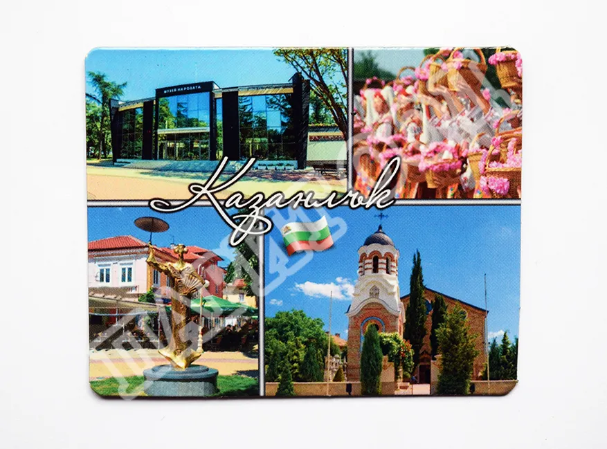 Сувенирен магнит със снимки от Казанлък . Предлага се опакован в щендерен целофан.