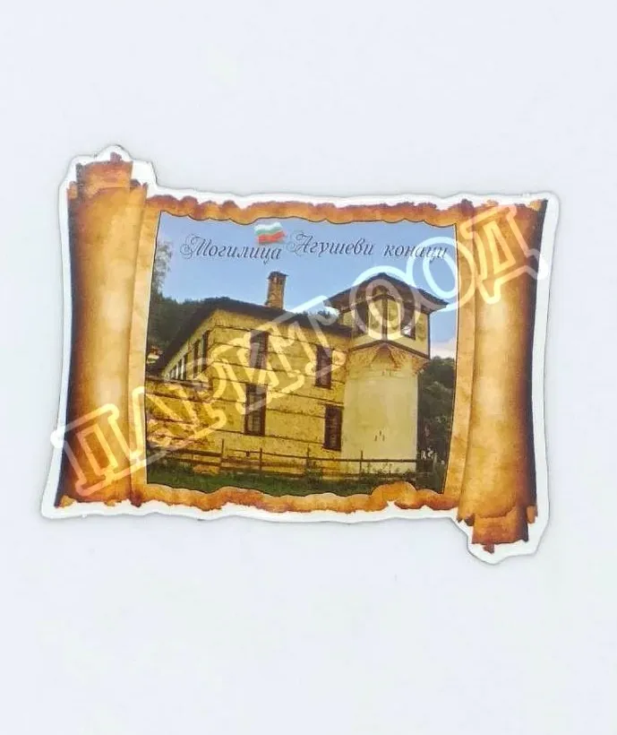 Сувенирен магнит със снимка от с. Могилица, Агушеви конаци. Предлага се опакован в щендерен целофан.