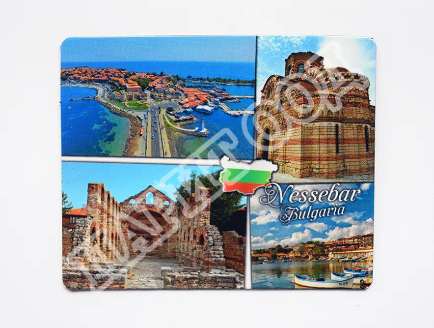 Сувенирен магнит със снимки от Несебър. Предлага се опакован в щендерен целофан.