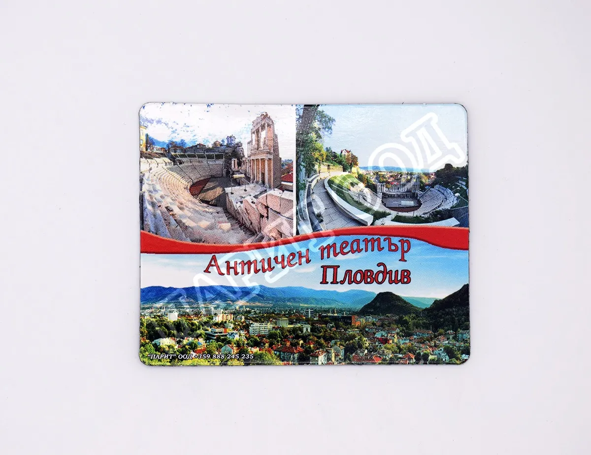 Сувенирен магнит със снимки от Пловдив. Предлага се опакован в щендерен целофан.