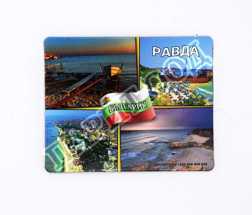Сувенирен магнит със снимки от Равда. Предлага се опакован в щендерен целофан.