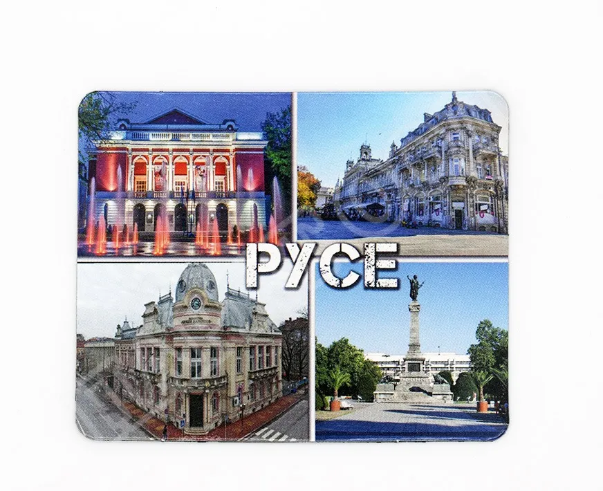 Сувенирен магнит със снимки от Русе. Предлага се опакован в щендерен целофан.