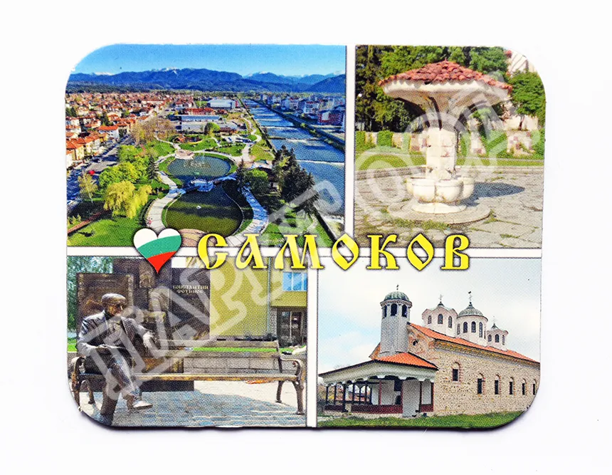 Сувенирен магнит със снимки от Самоков. Предлага се опакован в щендерен целофан.