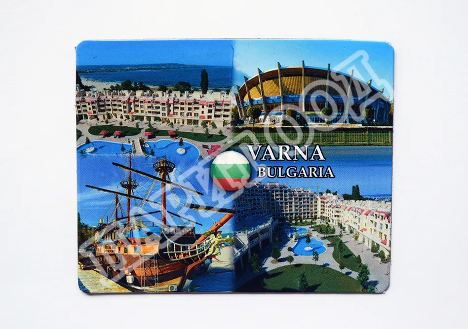Сувенирен магнит със снимки от Варна и надпис Варна, България. Предлага се опакован в щендерен целофан.