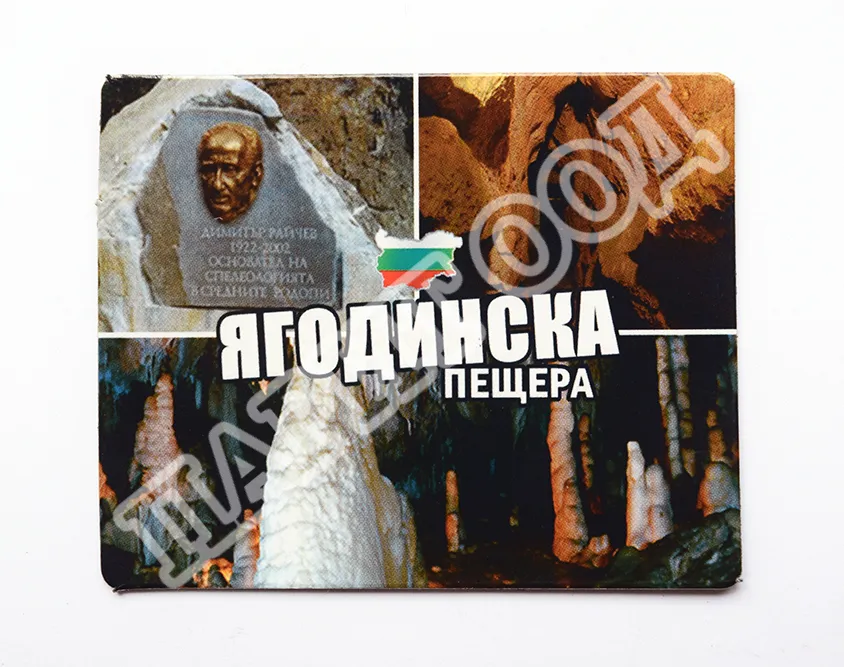 Сувенирен магнит със снимки от Ягодинска пещера, с. Ягодина. Предлага се опакован в щендерен целофан.