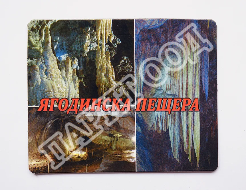 Сувенирен магнит със снимки от Ягодинска пещера, с. Ягодина. Предлага се опакован в щендерен целофан.