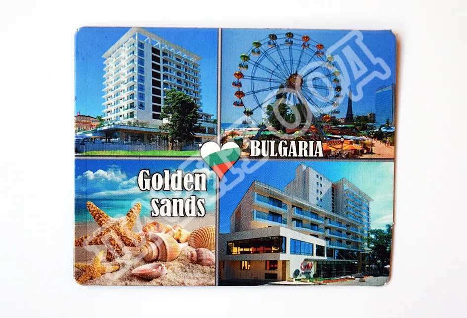 Сувенирен магнит със снимки от Златни пясъци. Предлага се опакован в щендерен целофан.