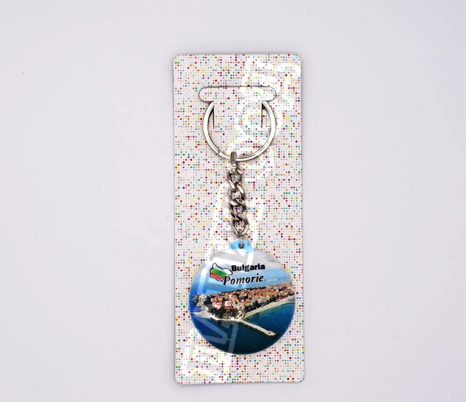 Метален ключодържател-отварачка със снимка от Поморие. Предлага се опакован в щендерен целофан.