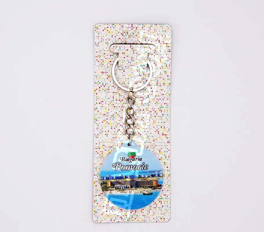 Метален ключодържател-отварачка със снимка от Поморие. Предлага се опакован в щендерен целофан.