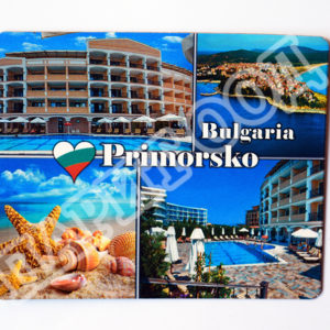 Сувенирна магнитна фигурка във форма на пощенска марка със снимка от Приморско. Предлага се опакована в щендерен целофан.