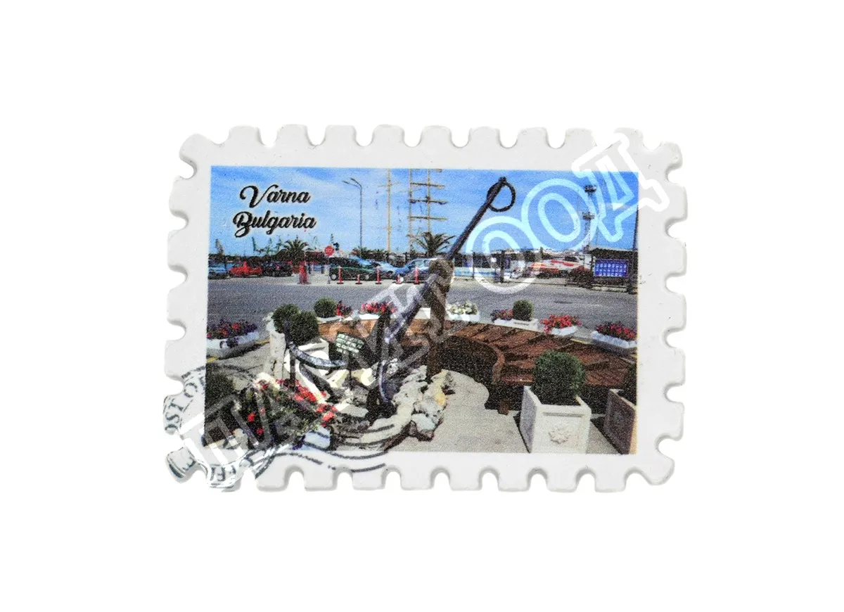 Сувенирна магнитна фигурка във форма на пощенска марка и със снимка от Варна. Предлага се опакована в щендерен целофан.