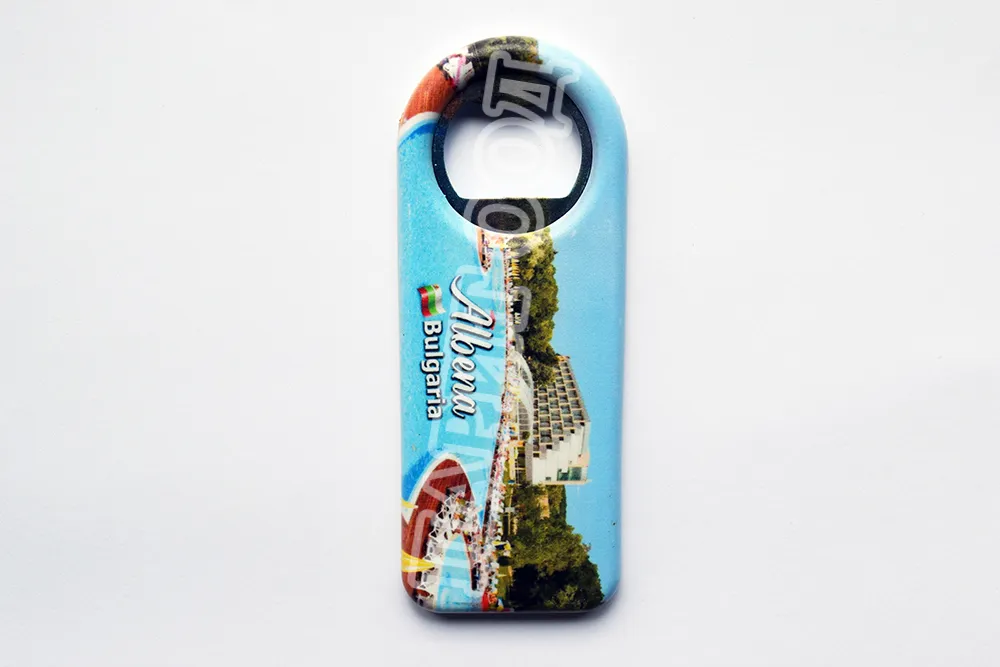 Сувенирна магнитна отварачка със снимка от Албена и надпис Албена, България. Предлага се опакована в щендерен целофан.