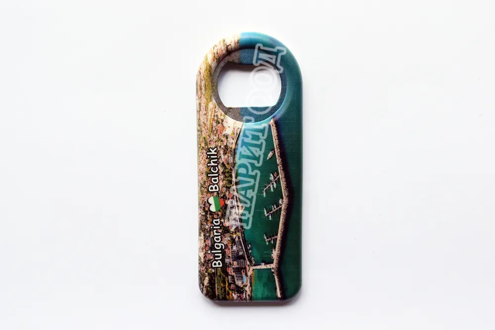 Сувенирна магнитна отварачка със снимка от Балчик и надпис Балчик, България. Предлага се опакована в щендерен целофан.