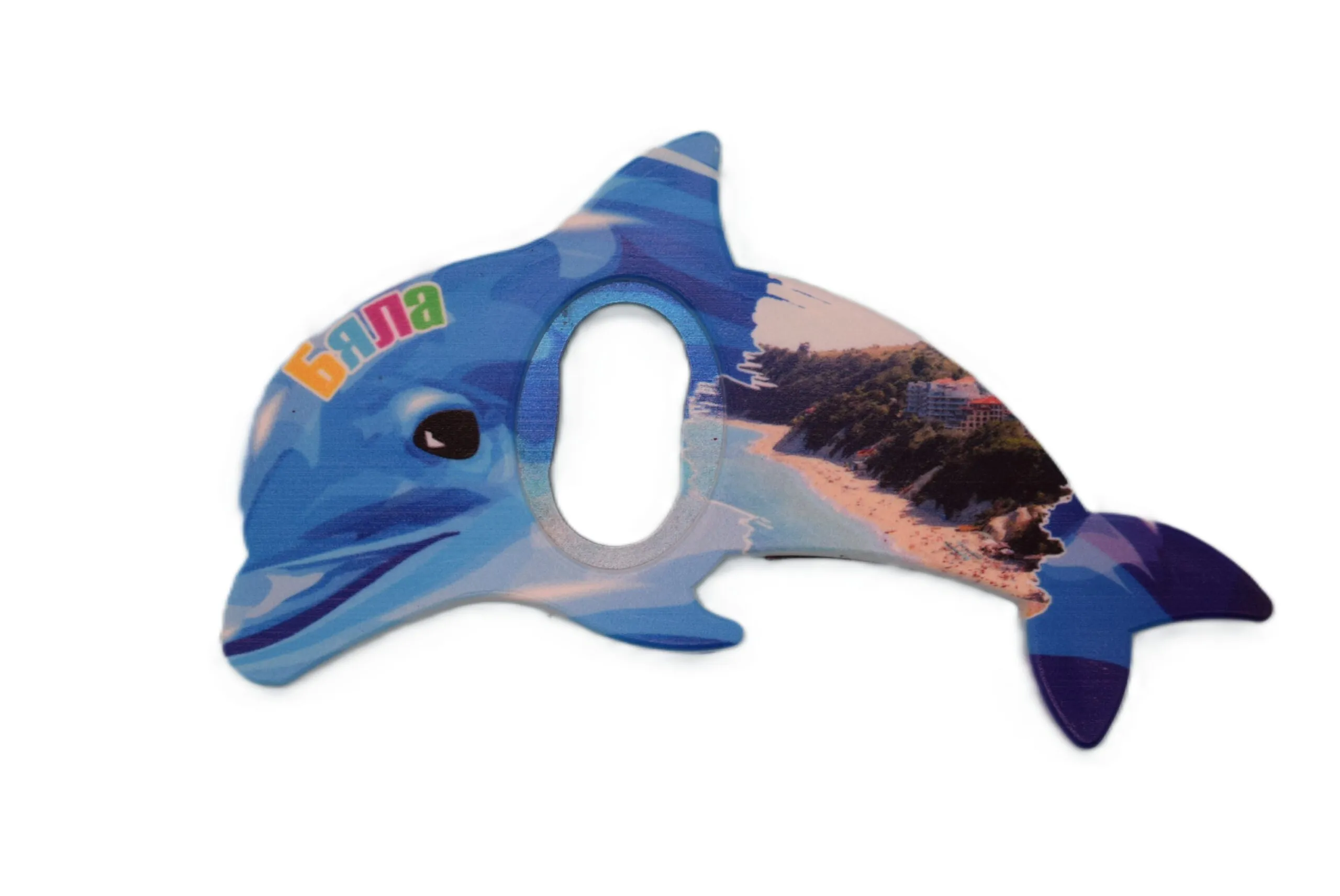 Сувенирна магнитна отварачка тип делфин с тематична снимка.