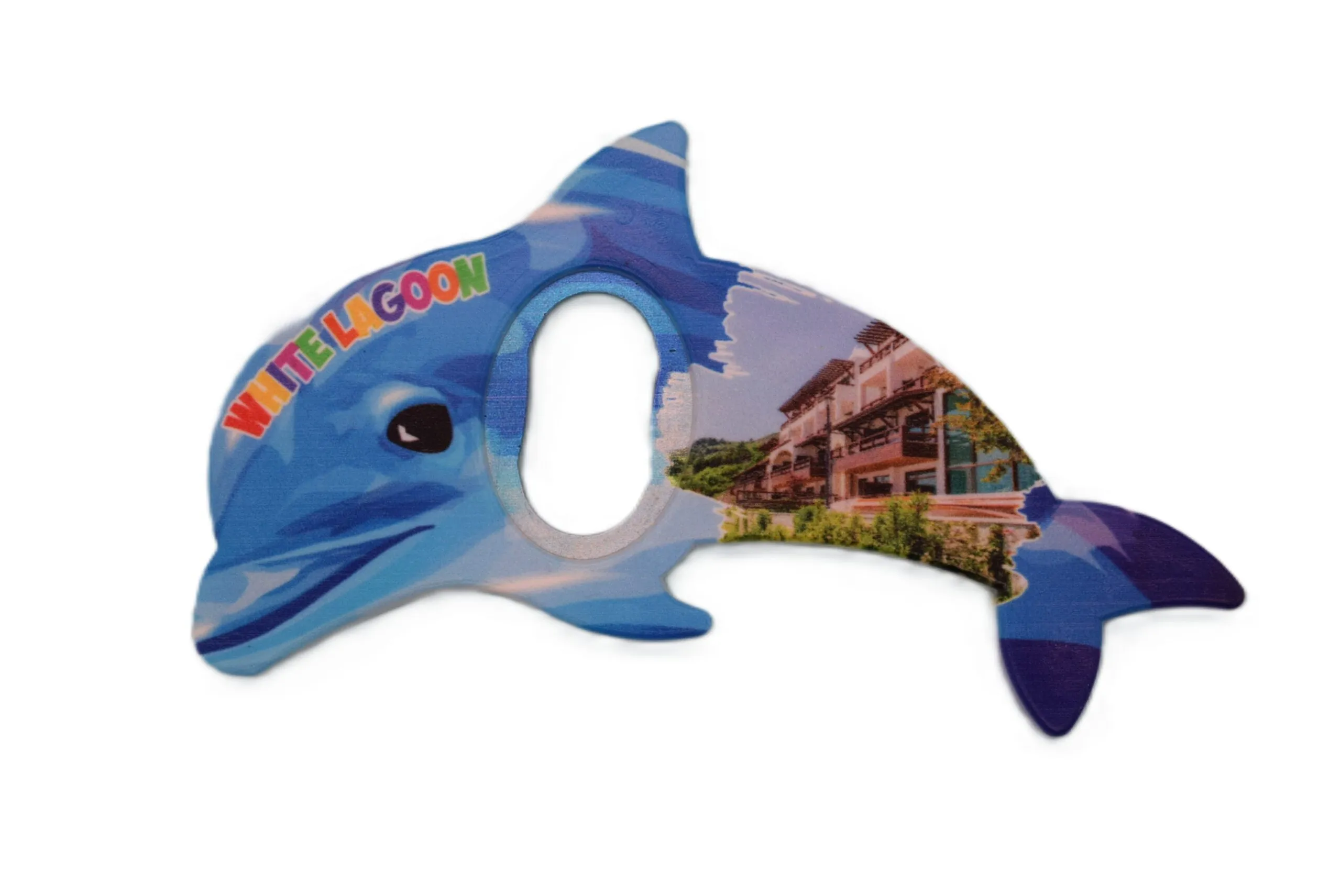 Сувенирна магнитна отварачка тип делфин с тематична снимка.