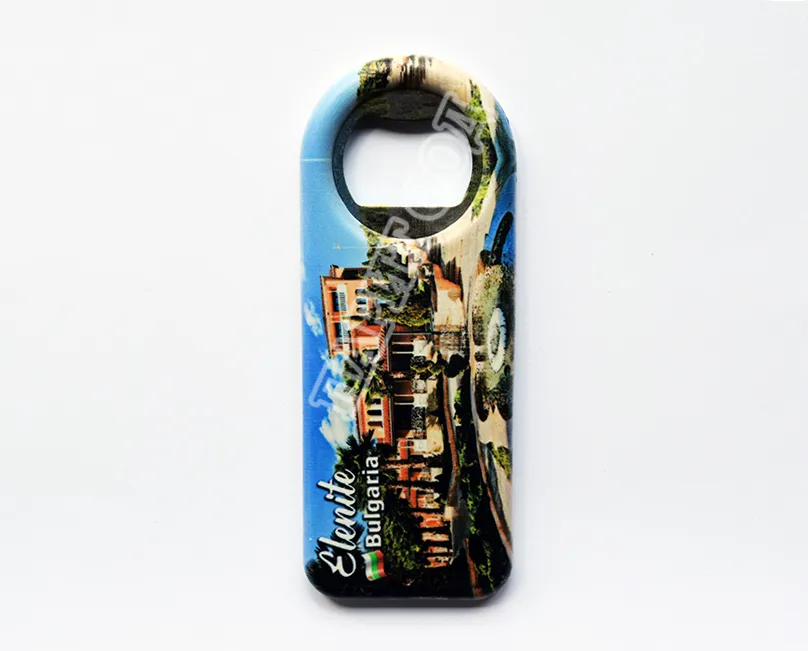 Сувенирна магнитна отварачка със снимка от ваканционно селище Елените и надпис Елените, България. Предлага се опакована в щендерен целофан.