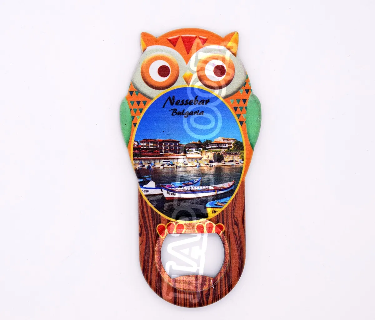 Сувенирна магнитна отварачка “сова“ със снимка от Несебър. Предлага се опакована в щендерен целофан.