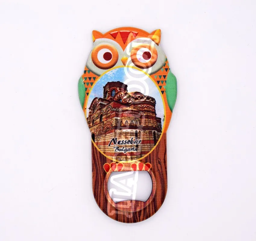 Сувенирна магнитна отварачка “сова“ със снимка от Несебър. Предлага се опакована в щендерен целофан.