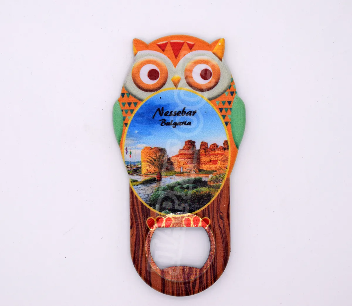Сувенирна магнитна отварачка “сова“ със снимка от Несебър. Предлага се опакована в щендерен целофан.