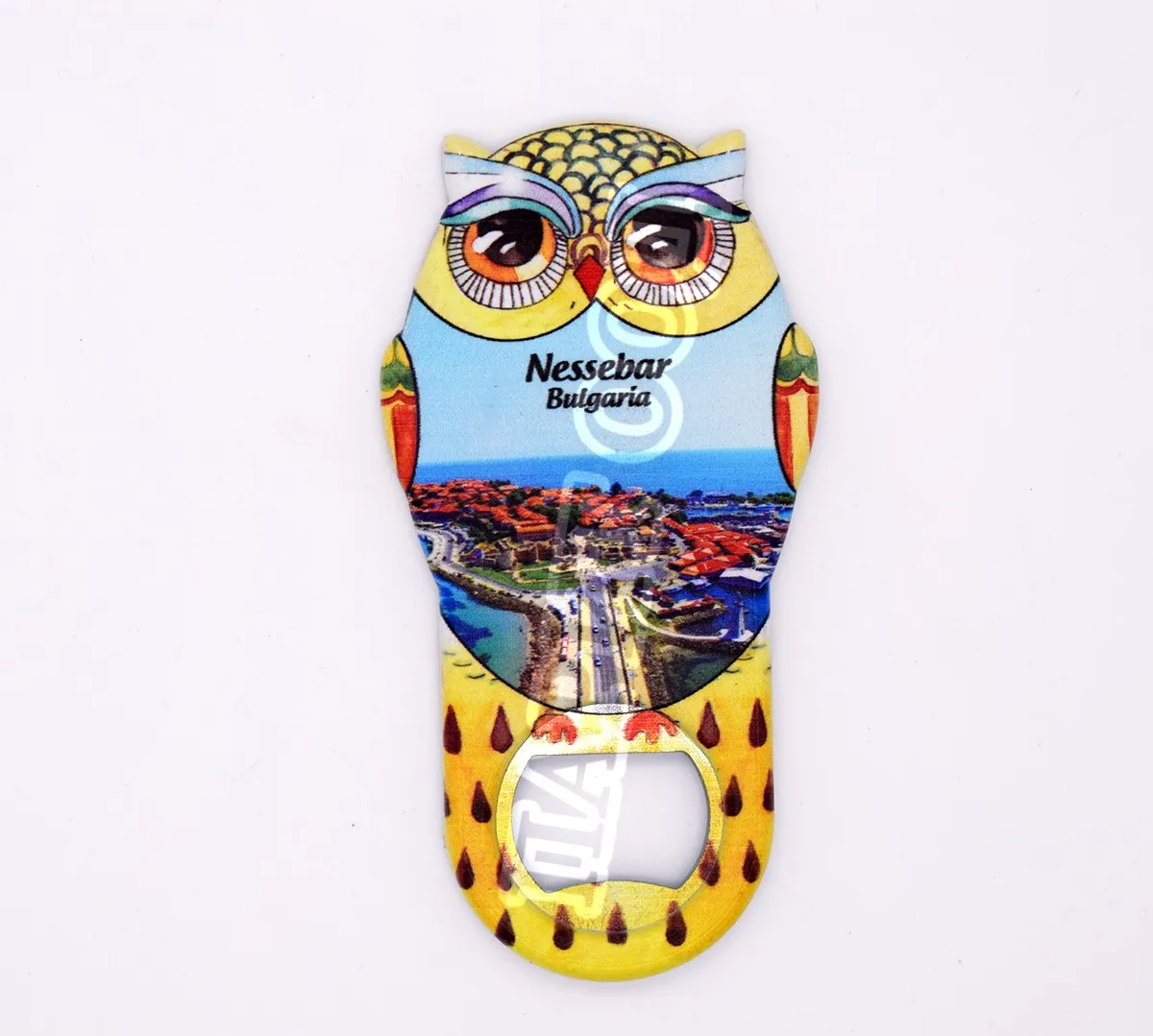 Сувенирна магнитна отварачка “сова“ със снимка от Несебър. Предлага се опакована в щендерен целофан.