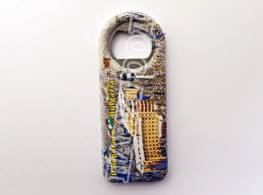 Сувенирна магнитна отварачка със снимка от Пампорово и надпис Пампорово, България. Предлага се опакована в щендерен целофан.
