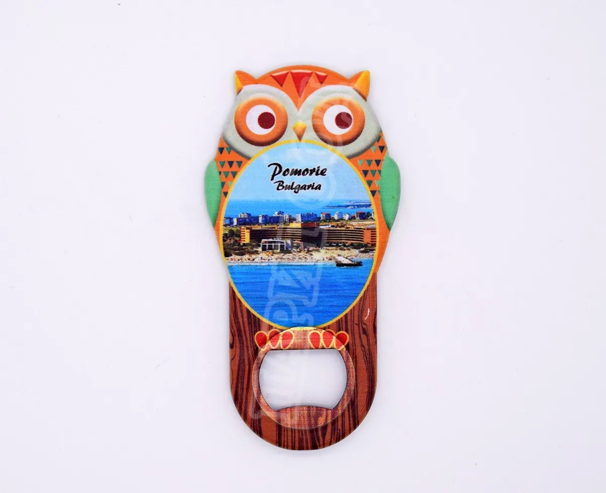 Сувенирна магнитна отварачка “сова“ със снимка от Поморие. Предлага се опакована в щендерен целофан.
