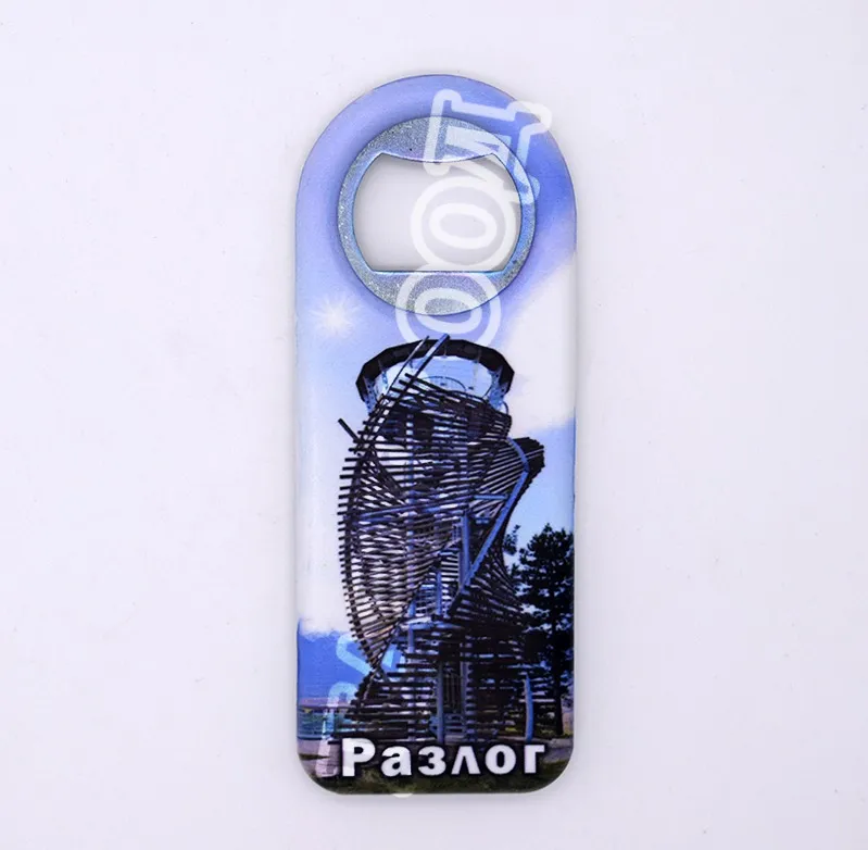 Сувенирна магнитна отварачка със снимка Разлог. Предлага се опакована в щендерен целофан.
