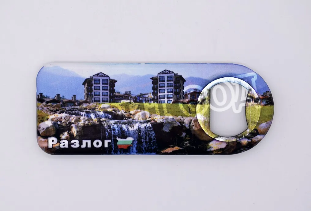 Сувенирна магнитна отварачка със снимка Разлог. Предлага се опакована в щендерен целофан.