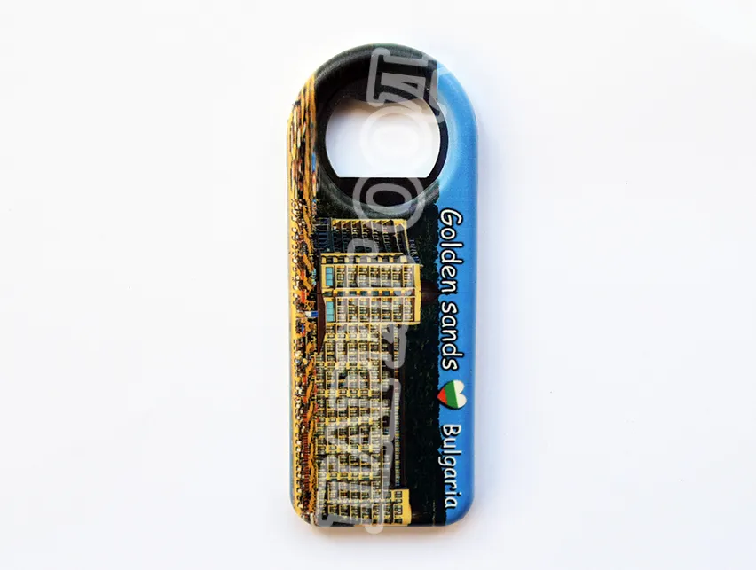 Сувенирна магнитна отварачка със снимка от к.к. Златни пясъци и надпис Златни пясъци, България. Предлага се опакована в щендерен целофан.
