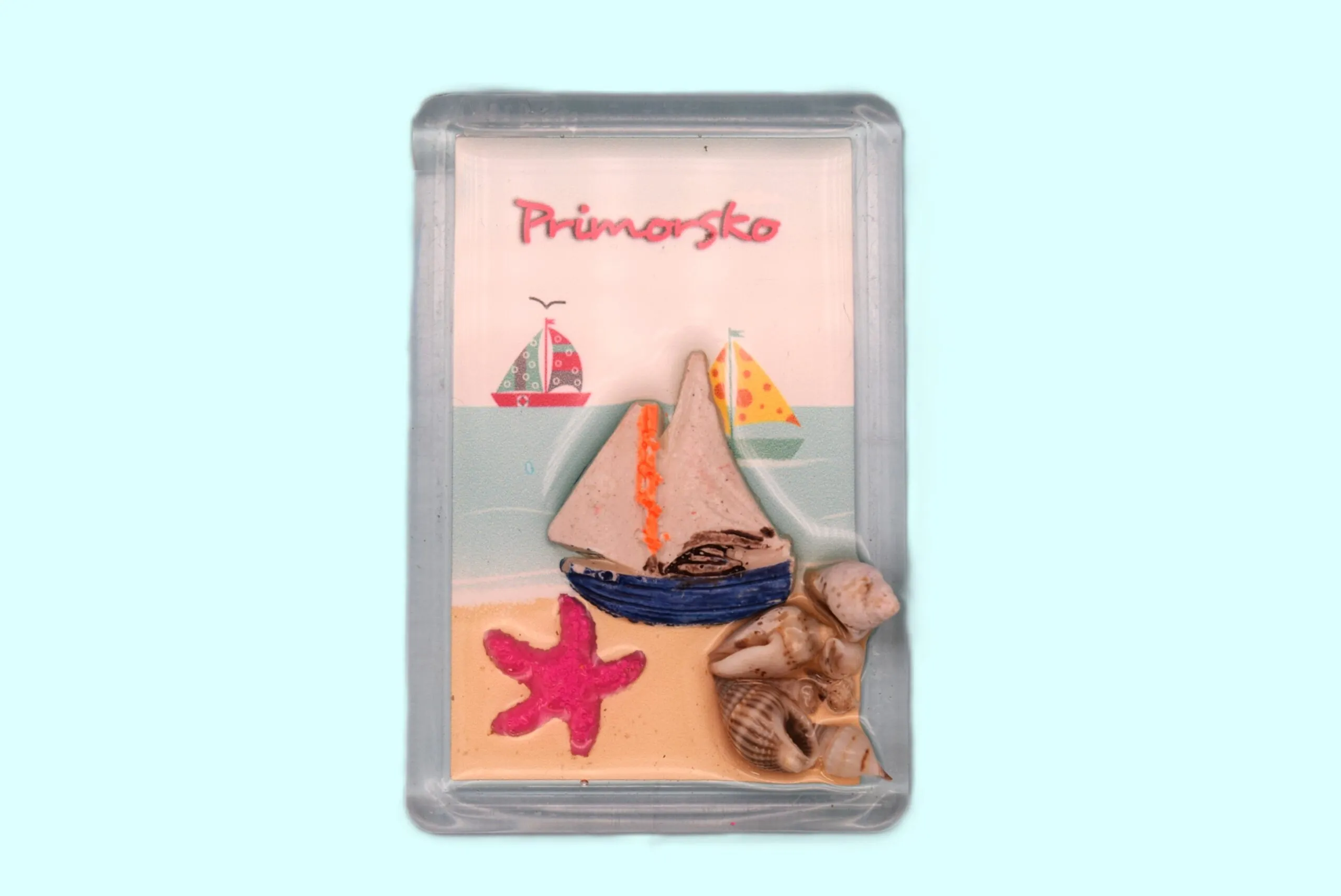 Ръчно изработен релефен магнит във формата на правоъгълна плочка, инкрустиран със стилни мъниста, истински мидени черупки, декоративни фигурки и тематична снимка, запечатани с прозрачен слой епоксидна смола.
