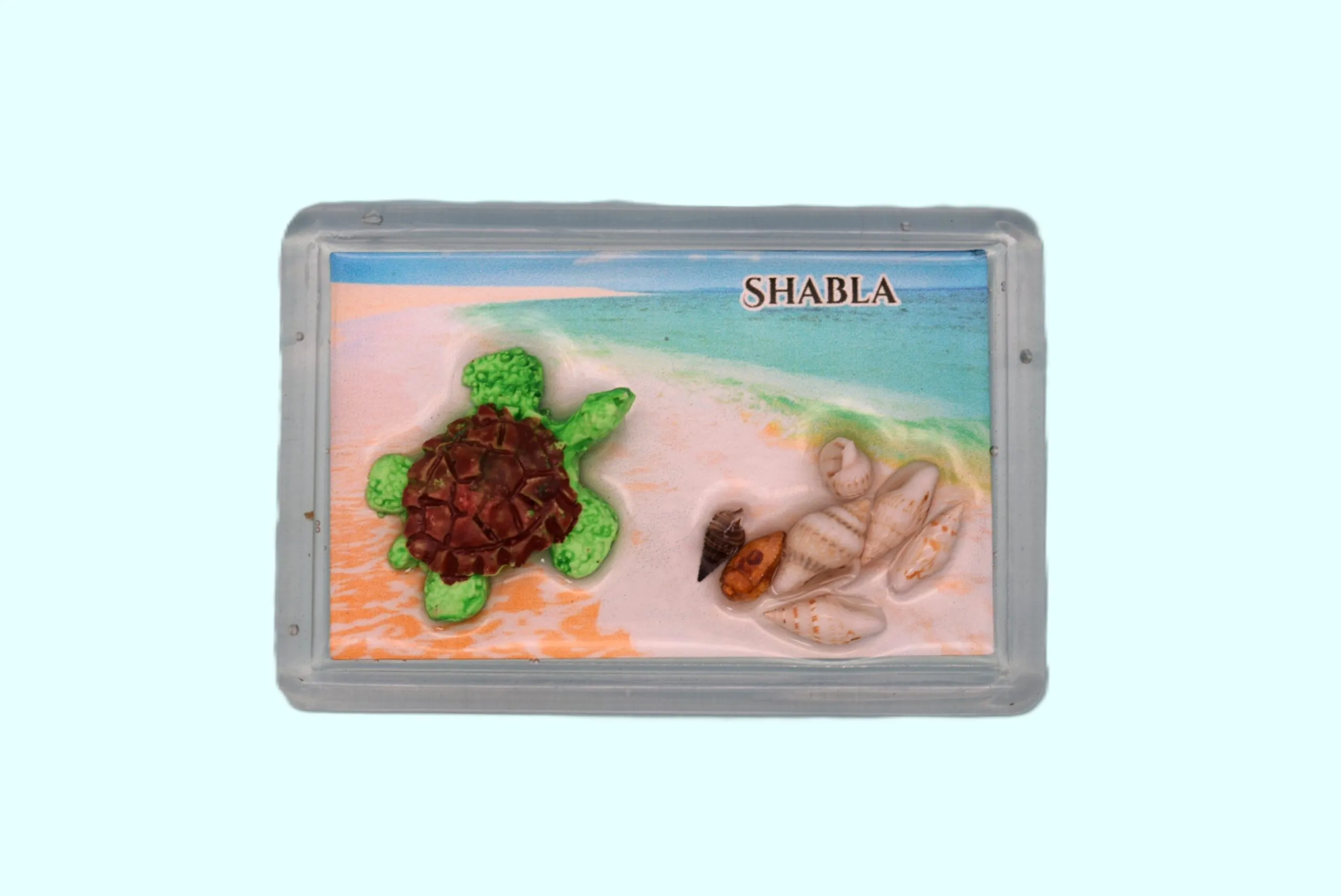 Ръчно изработен релефен магнит във формата на правоъгълна плочка, инкрустиран със стилни мъниста, декоративни фигурки, истински мидени черупки и тематична снимка, запечатани под прозрачен слой качествена епоксидна смола.
