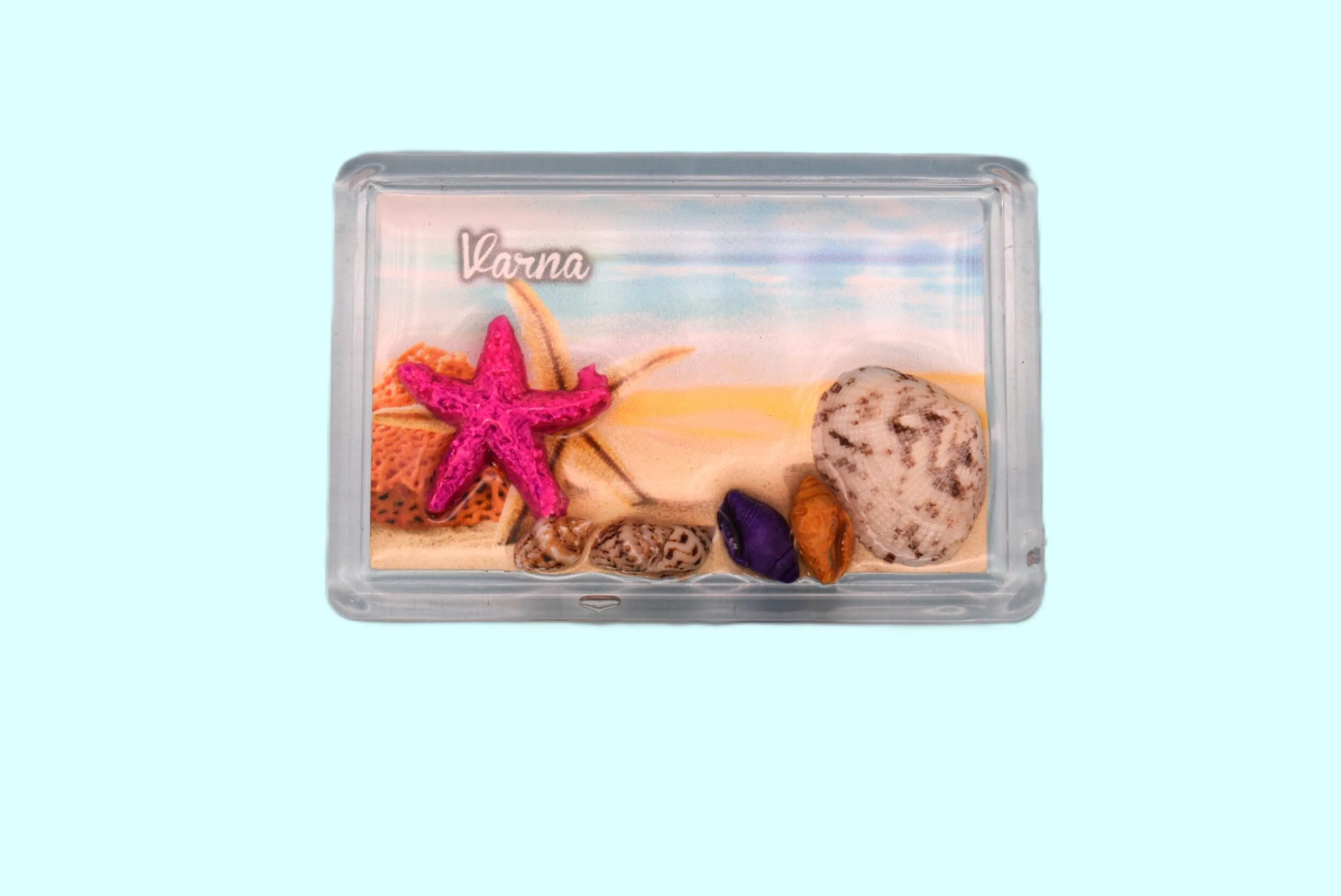 Ръчно изработен релефен магнит във формата на правоъгълна плочка, инкрустиран със стилни мъниста, истински мидени черупки, декоративни фигурки и тематична снимка, запечатани с прозрачен слой епоксидна смола.