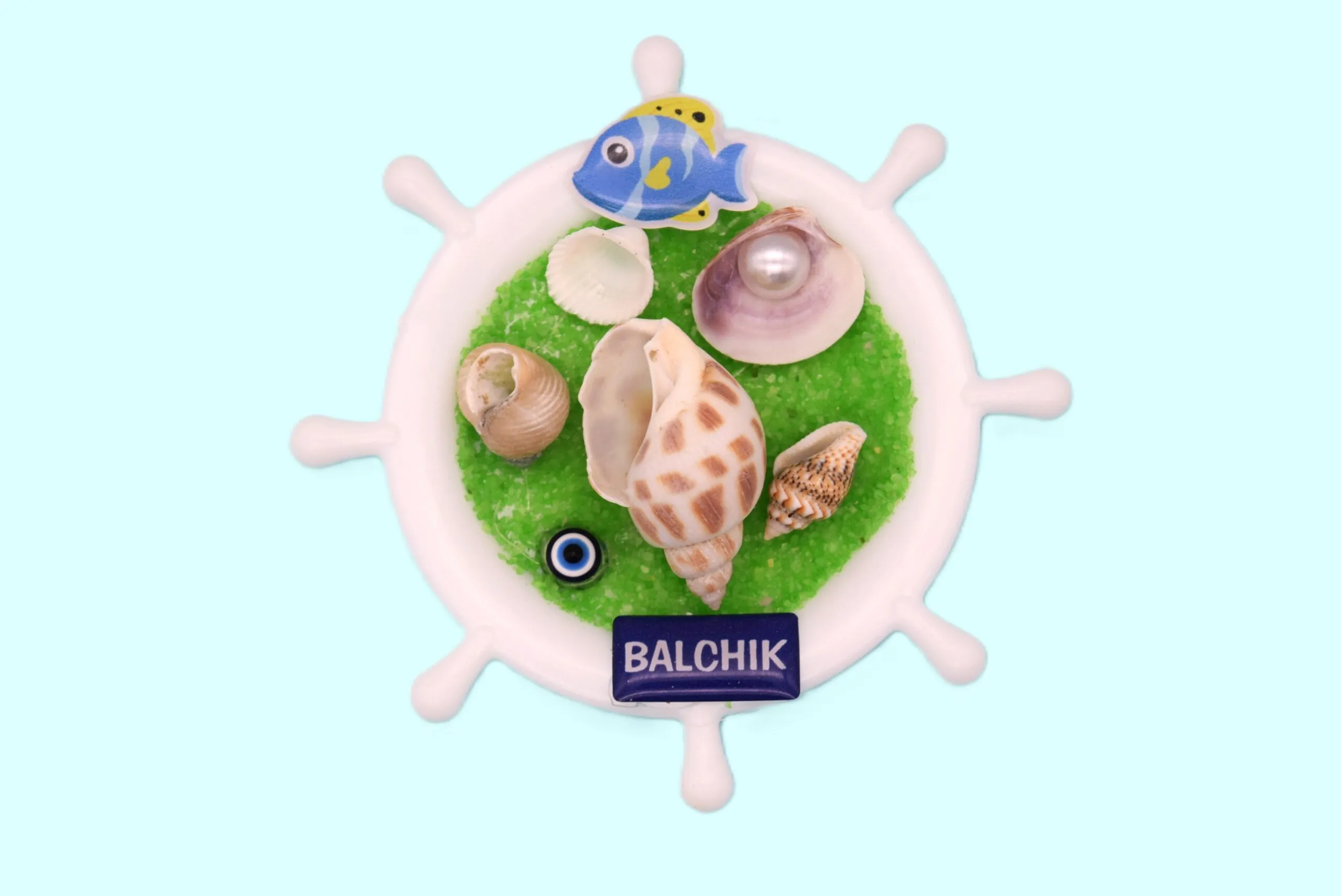 Ръчно изработен релефен 3D магнит тип корабен рул, инкрустиран с истински мидени черупки, стилни мъниста, декоративни фигурки и цветен пясък.