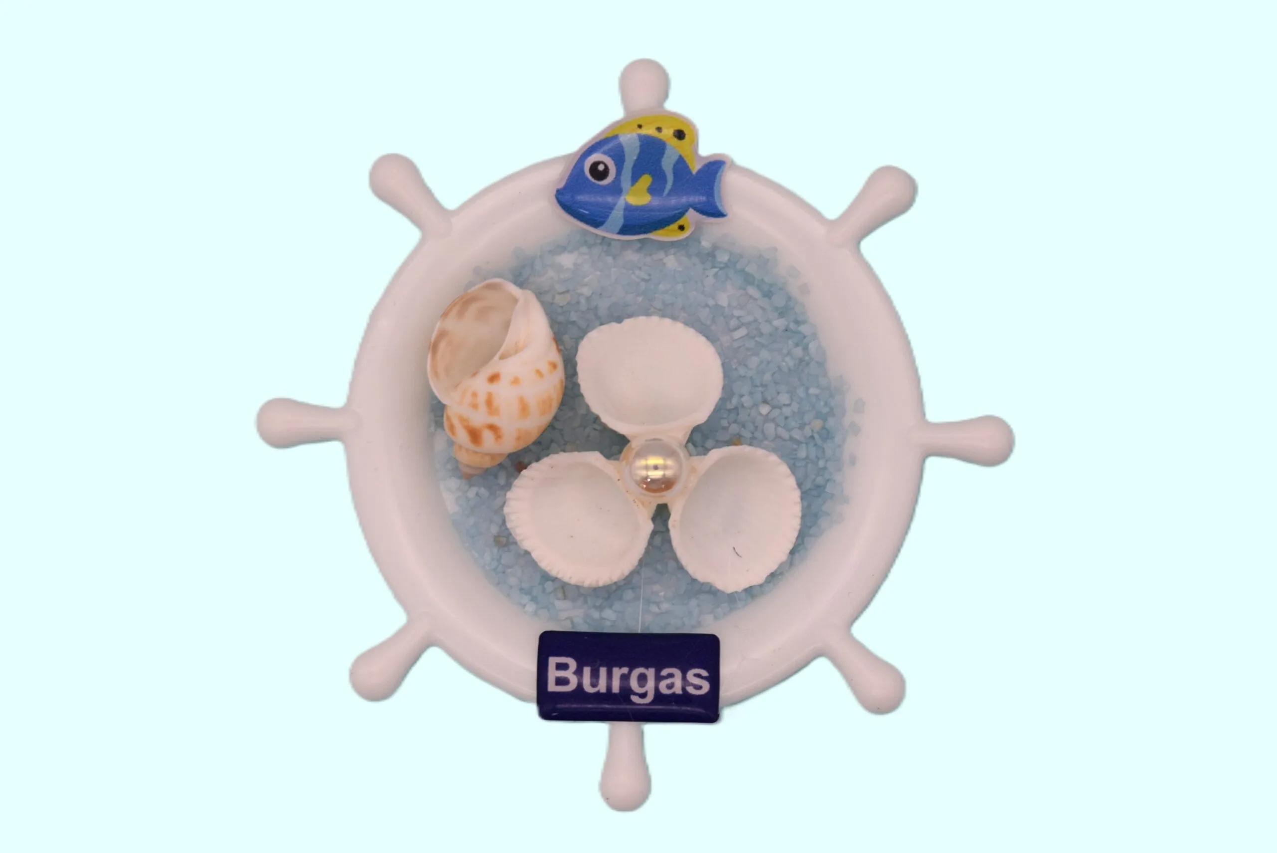 Ръчно изработен релефен 3D магнит тип корабен рул, инкрустиран с истински мидени черупки, стилни мъниста, декоративни фигурки и цветен пясък.