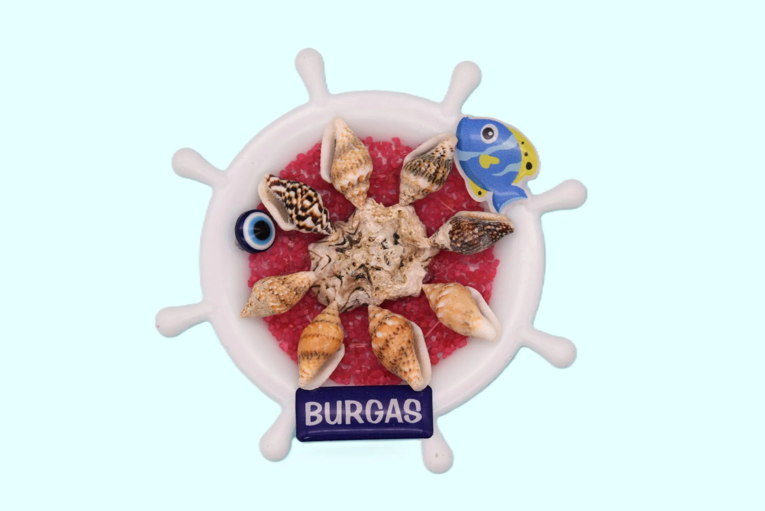 Ръчно изработен релефен 3D магнит тип корабен рул, инкрустиран с истински мидени черупки, стилни мъниста, декоративни фигурки и цветен пясък.