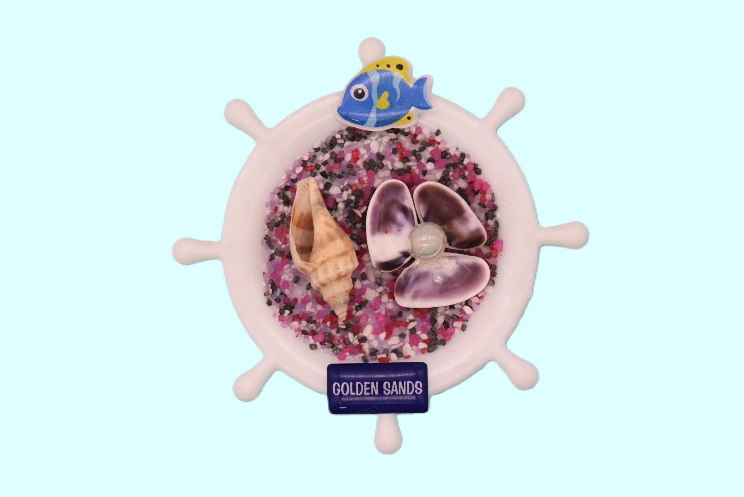 Ръчно изработен релефен 3D магнит тип корабен рул, инкрустиран с истински мидени черупки, стилни мъниста, декоративни фигурки и цветен пясък.