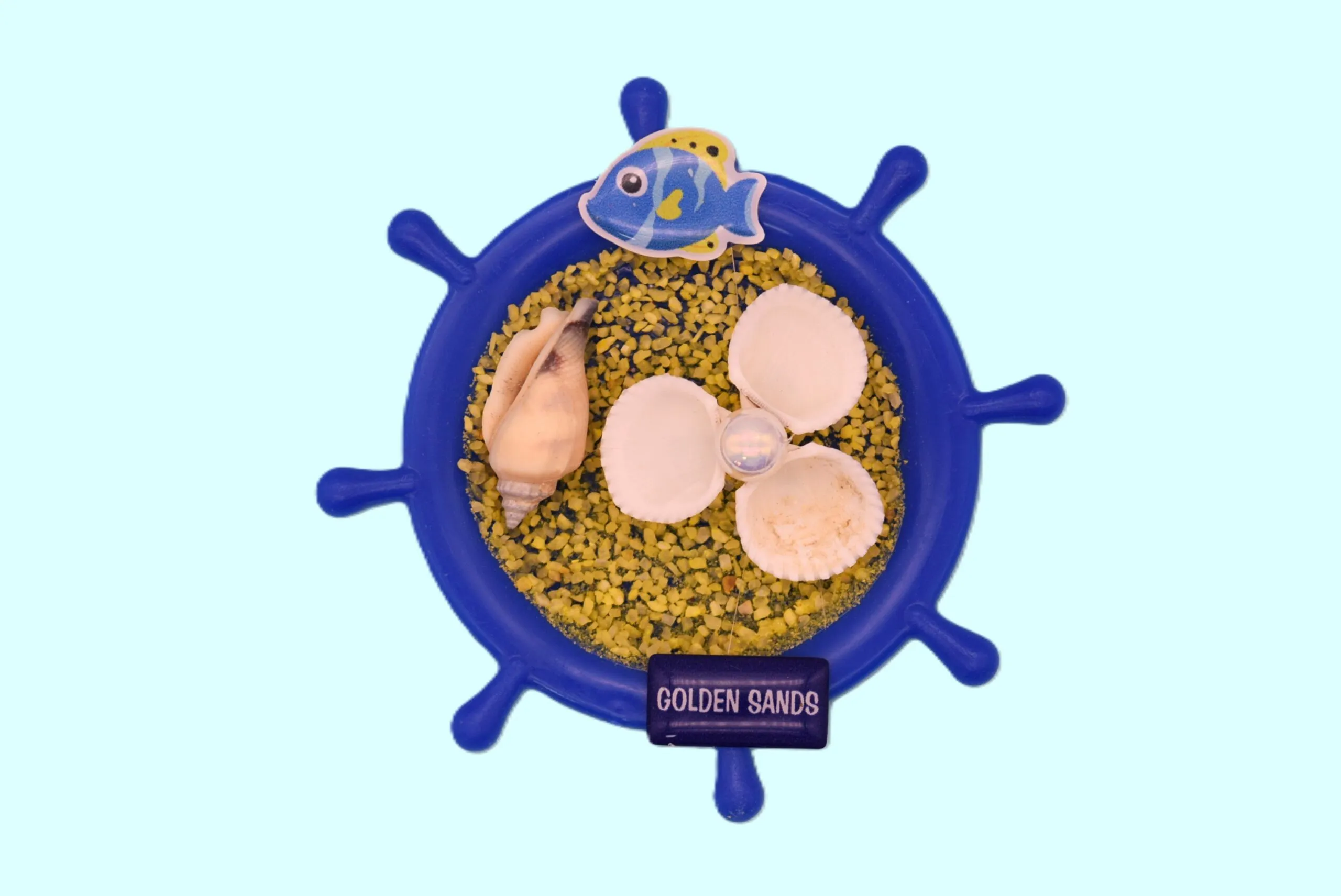 Материали: пластмаса, магнитно фолио, мъниста, истински мидени черупки, фигурки, цветен пясък