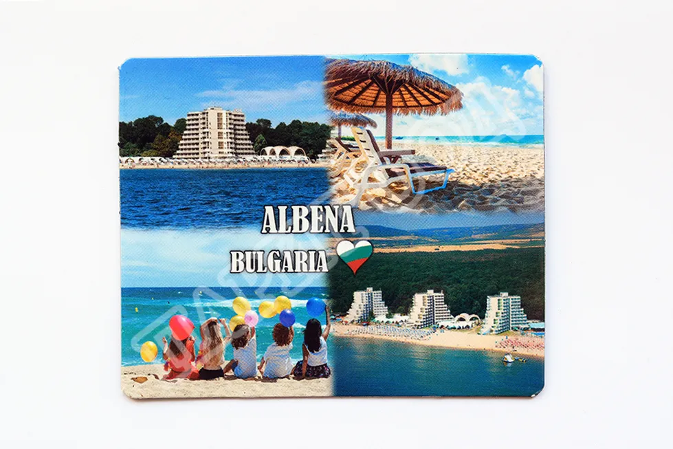 Сувенирен магнит със снимки от Албена и надпис Албена, България. Предлага се опакован в щендерен целофан.