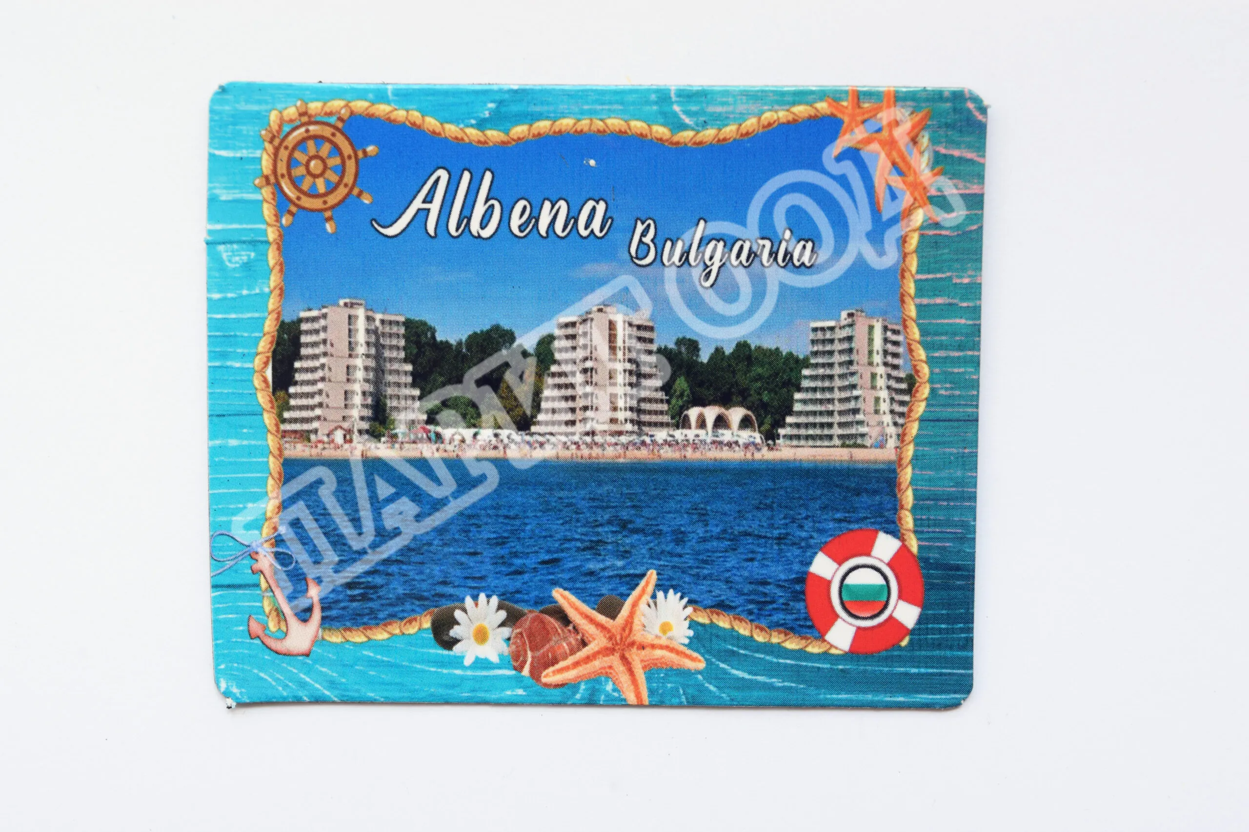 Сувенирен магнит със снимка от Албена и надпис Албена, България. Предлага се опакован в щендерен целофан.
